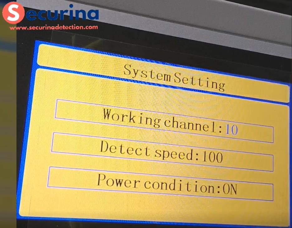 - System: Working channel:1-100 in option, avoid the same channel of several units walk through metal detector working together will get false alarm.Should be adjusted different channel; Detetct speed: detection speed value from 1-100 in option; Power condition: ON/OFF, Turn on power condition means system can automatic switch on once connected with power supply. Power condition OFF should be manually switch on the system.
