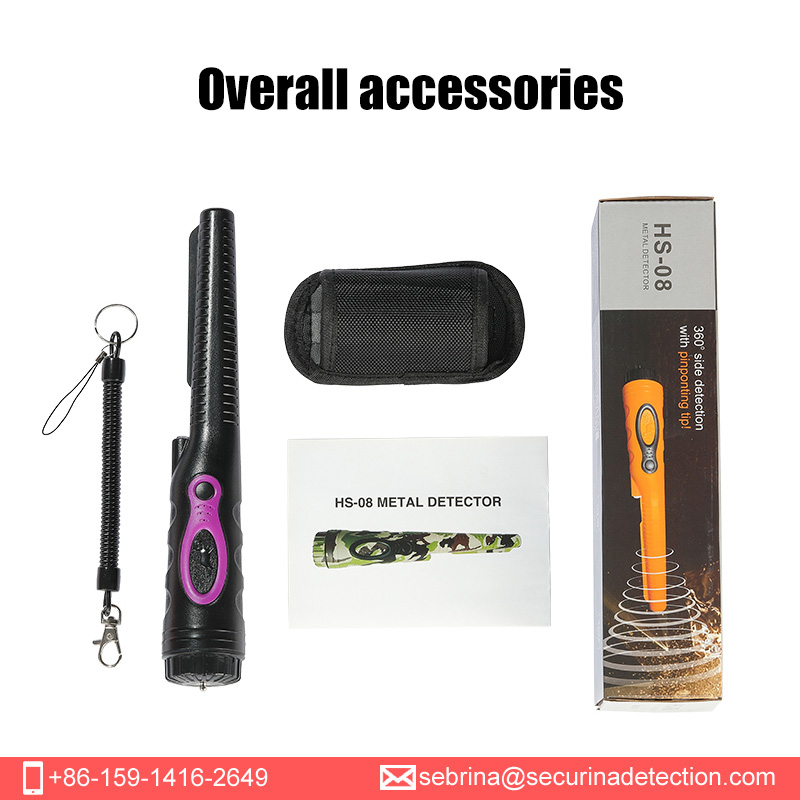 ----- 360 Degree metal detection and Optional Three Mode: Audio, Vibrate, Audio and Vibrate at the same time. Portable metal detector HS-08 is suitable for quiet, noisy, seabed and other different environments.